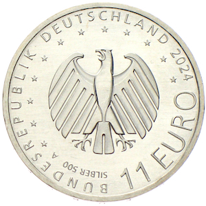 Die 11-Euro-Sammlermünze zur UEFA Fußball-Europameisterschaft 2024 ist mit diesem originellen Nominalwert eine Besonderheit der deutschen Münzausgaben. Die vom kölner Künstler Detlef Behr gestaltete Münze zeigt eine stilisiert Draufsicht des Berliner Olympiastadions, wo das Finale der EM stattfinden wird. Die in den deutschen Nationalfarben kolorierten Eckfahnen umrahmen den mittigen Fußball. Die Zahl 10 verweist auf die Austragungsorte der EM. Die Wertseite mit dem Bundesadler wurde von Lorenz Crössmann aus Berlin entworfen. Bei einem Durchmesser von 30 Millimetern und einem Gewicht von 14 Gramm besteht die Münze aus 500/1000 Silber. Die Auflage in der Prägequalität Spiegelglanz beträgt 111111 Stück.