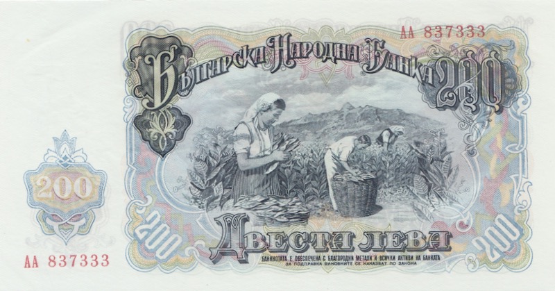 Bulgarien 200 Lewa Banknote 1951 - Georgi Dimitrov (von 1946 bis 1949 Ministerpräsident von Bulgarien), rückseitig Arbeiter bei der Tabakernte.
