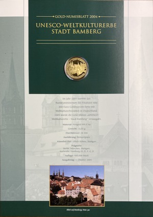 Der begleitende Text der Gold-Numisblätter wurde hier nicht mit gestempelten Briefmarken-Zehnerbögen kombiniert, sondern postfrischen Briefmarken der Bundesrepublik in DM und Euro, sowie Briefmarken aus der DDR, die thematisch mit der Münze im Numisblatt verwandt sind.